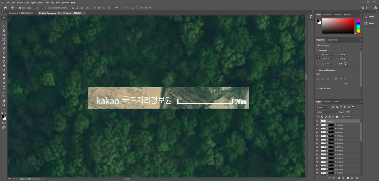 이때, 주의할 점으로는 scale bar를 붙여넣었는데 안보이는 경우가 있을수 있는데 이는, 붙여 넣었던 사진의 layer가 가장 아래 있기때문이다, 따라서 가장 아래있던 layer를 드래그하여 가장 위로 올려 놓으면, scale바를 사진속에서 찾을수 있다.