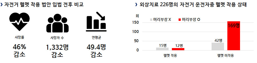 해외 연구결과 헬멧을 착용한 자전거의 경우 착용하지 않은 자전거에 비해 머리부상 진단받을 확률이 78.6%로 낮았고, 심각한 머리 부상을 입을 가능성도 현저히 낮았다.
