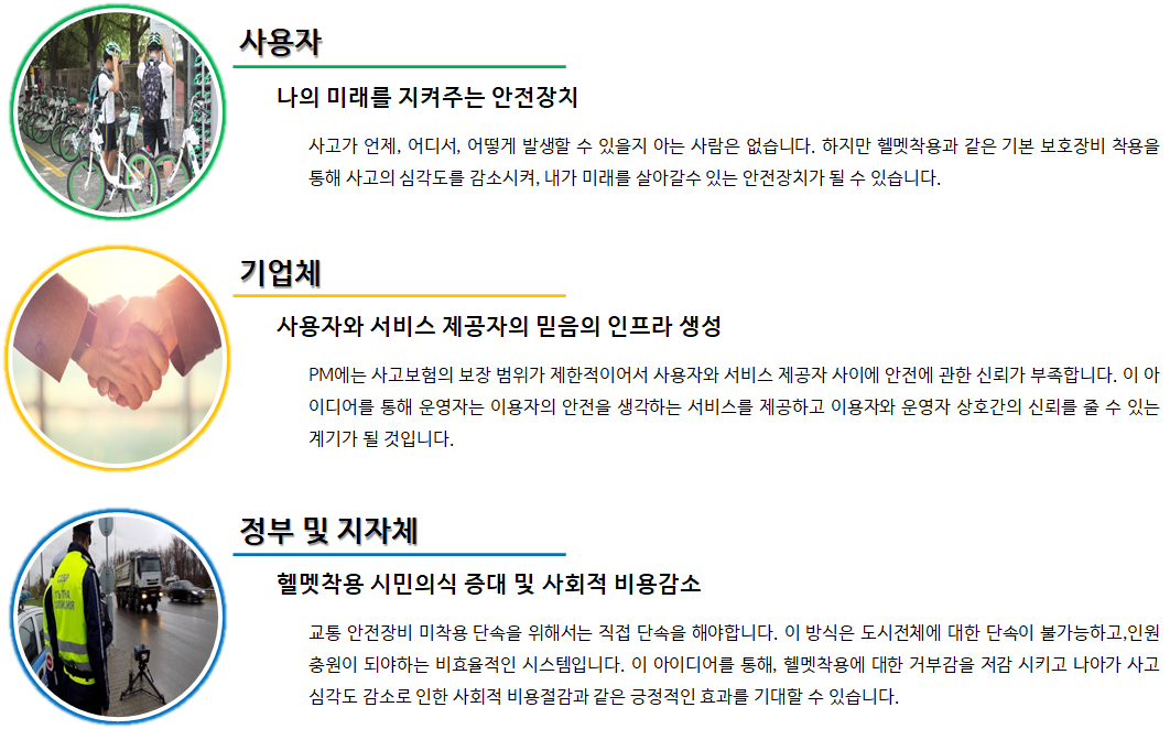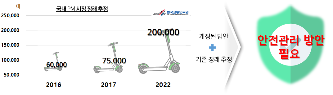 이미 대부분의 이용객들이 헬멧을 이용하고 있지 않는 상황에서, 최근 도로교통법 및 자전거 이용활성화 법률 개정으로 인해서 PM에 대한 진입장벽이 낮아지고 한국교통연구원에서는 장래 PM시장을 2022년에 200,000대 이상으로 증가될 것으로 예측하고 있다.