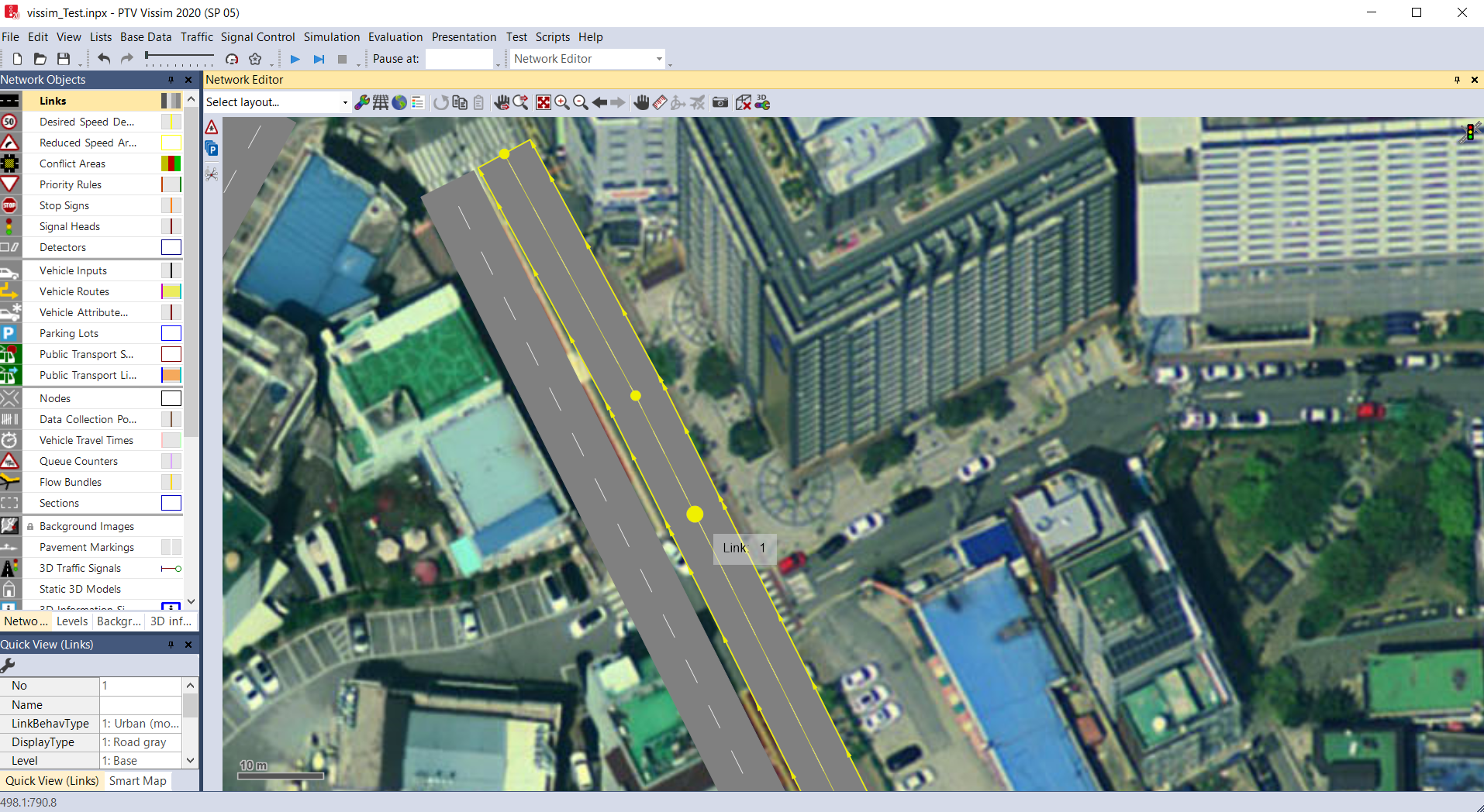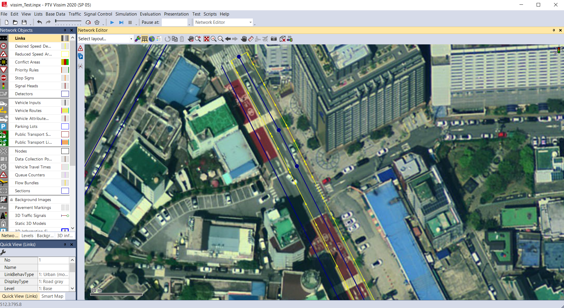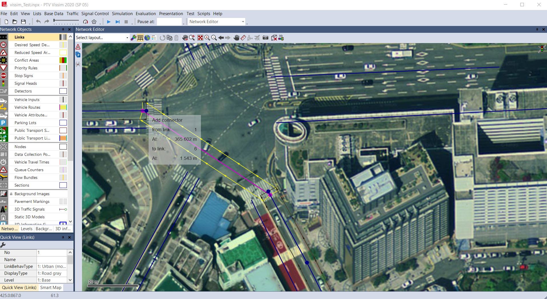 이와 같은 방식으로 링크와 커넥터를 베이스맵을 따라 도로 선형을 잘 표현하여 시뮬레이션에 기초가 되는 네트워크를 만들어보자.