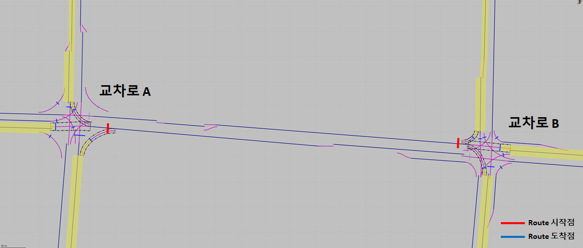 - 하지만, 교차로A에서 B로 이동하는 Route시작점은 교차로 A 남측에서 우회전하는 Connector보다 뒤에 위치한다.