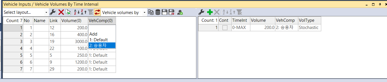 Vehicle Composition은 Vehicle Input에 연계되어 설정할 수 있는 지표로써, Composition list를 만들고 Input 입력창에서 교통량 및 구축한 차종비를 입력하는 것으로 된다.