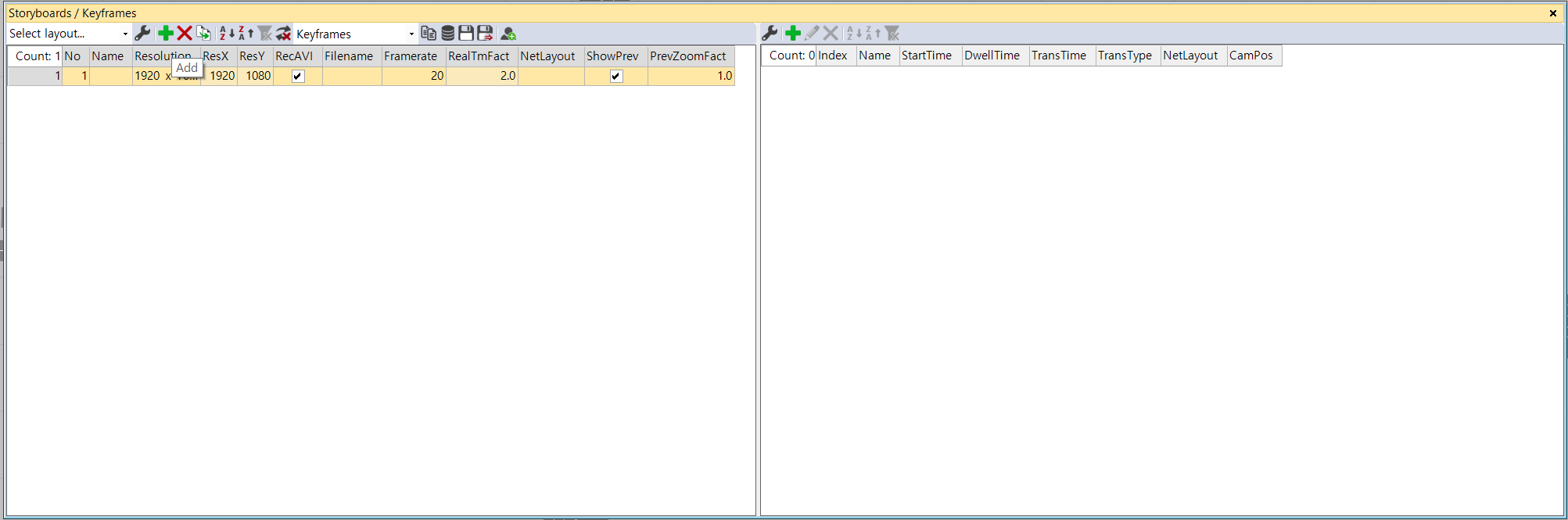 설정을 위해서는 메뉴바 -> Presentation -> Stroyboards에 위치한 list창을 열고 +버튼을 클릭하여 새로운 Storyboard 생성이 필요하다.