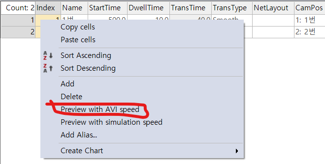 Vissim에서 동영상 찍기 전에 설정한 동영상 구도 및 화면전환이 제대로 이루어지는지 확인을 할 수 있도록 미리보기 기능을 제공한다.