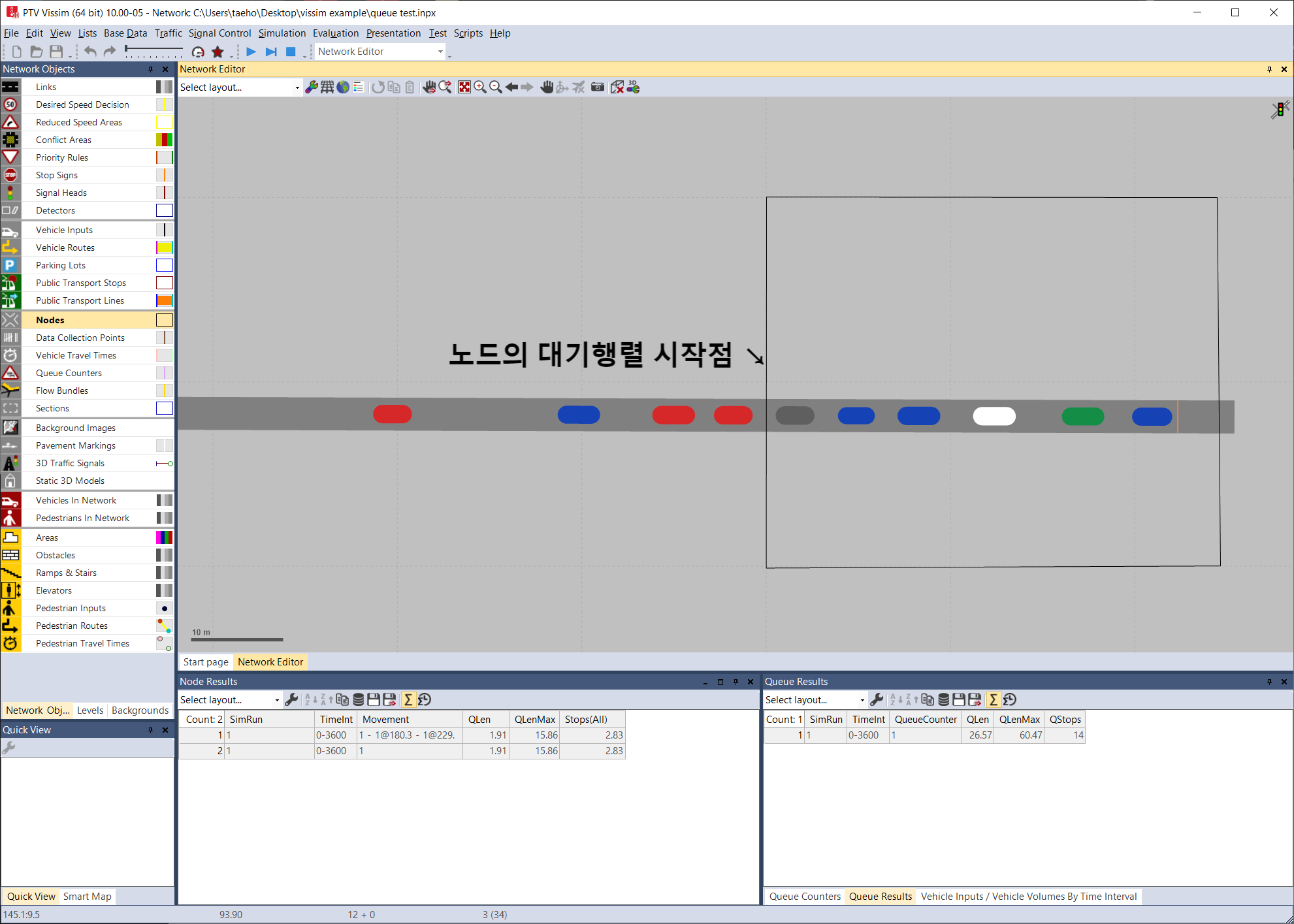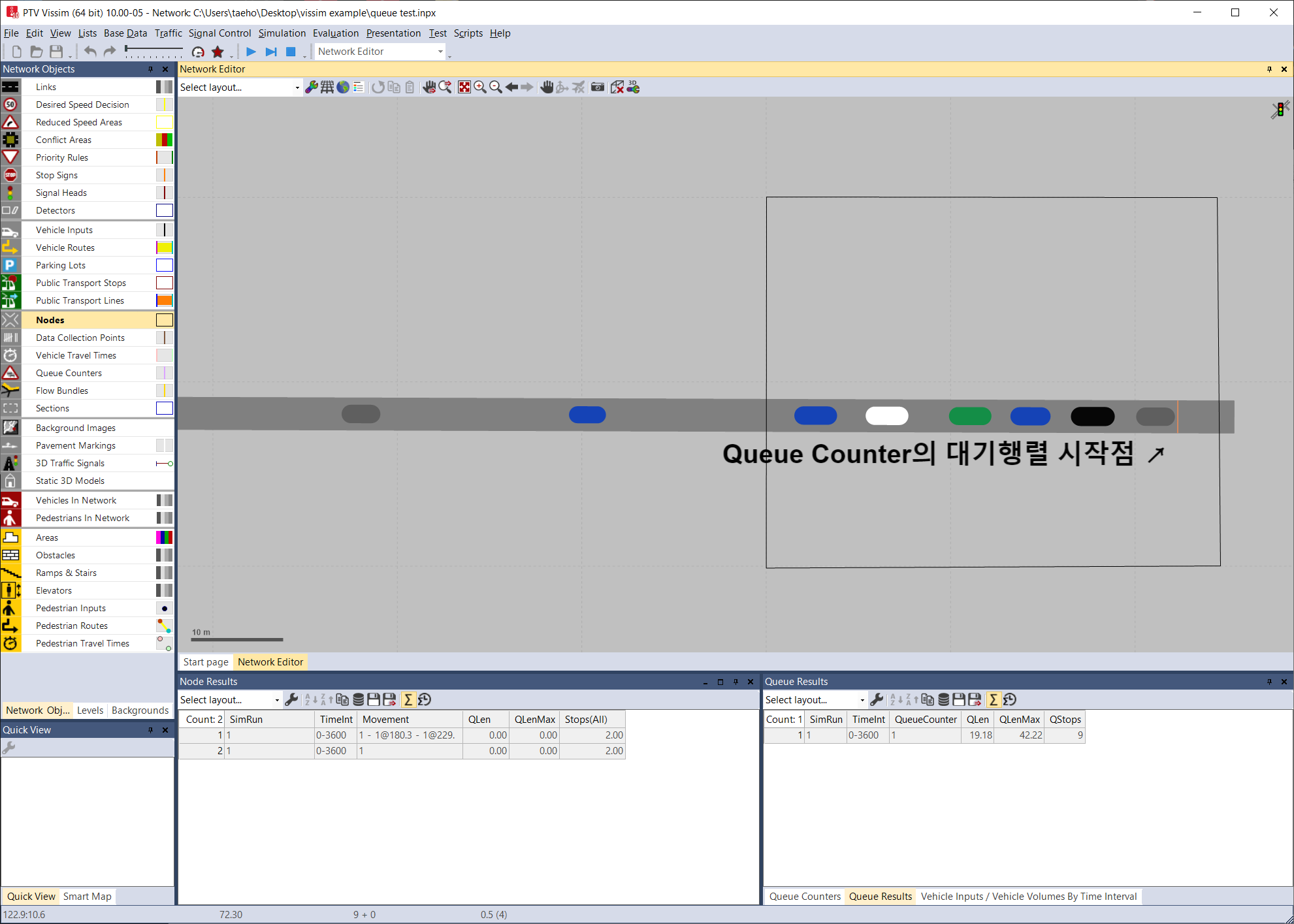 Queuecounter의 대기행렬을 측정하는 시작점은 해당 Object를 입력한 위치에서부터 시작하지만, 노드는 설정한 노드구획의 바깥쪽에서부터 측정을 시작한다.
