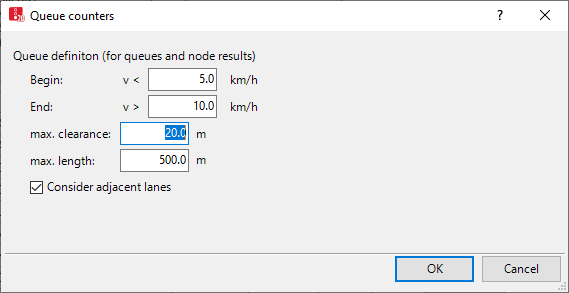 Vissim에서 대기행렬은 주로 "Queue Counter"는 교차로 정지선에 입력되어 최대/평균 대기행렬과 대기행렬로 인한 차량정지 횟수를 측정한다. 대기행렬은 속도를 기준으로 판단하고 최대 차두간격 및 대기행렬 설정을 수행할 수 있다. 기본 설정은 아래 그림과 같다. (Evaluation -> Configuration -> "Result Attributes" tap -> More button in Queue counters)