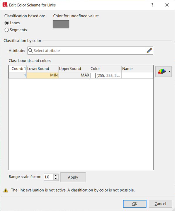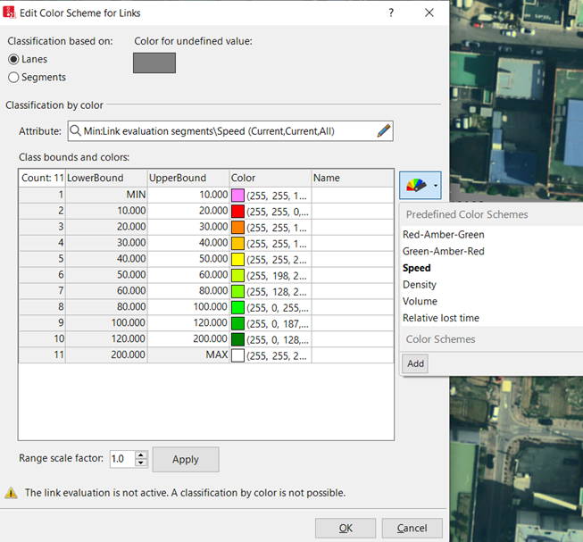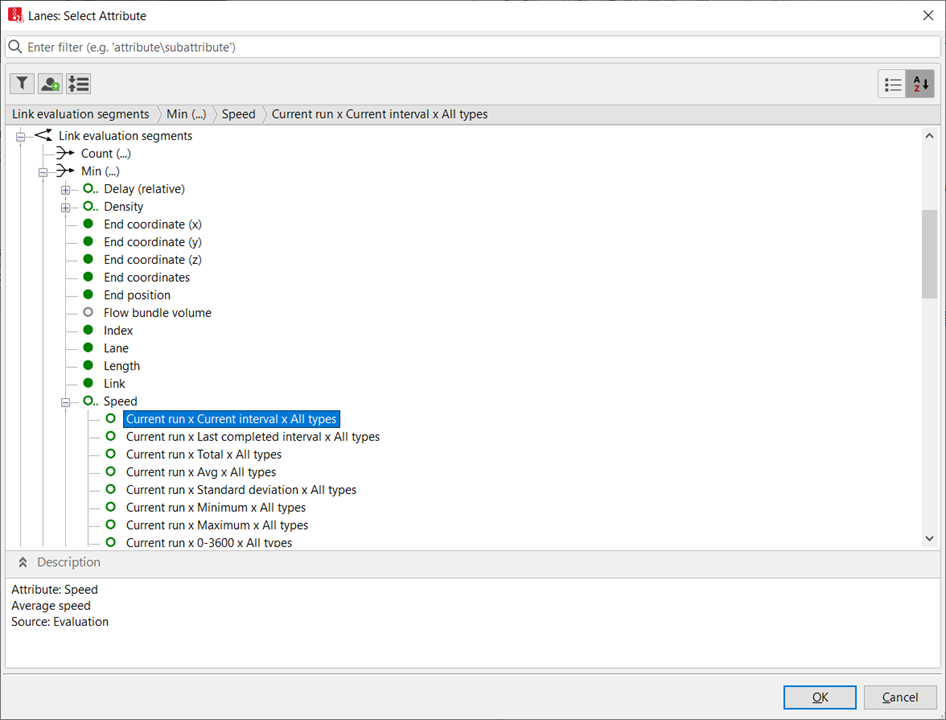 Attribute 설정창에서 Link evaluation segment _.min -> speed -> (current run x current interval x All types)를 선택한다. 이는 현재 시뮬레이션에서 현재 분석 interval 그리고 모든 차량에 대한 속도 정보를 불러온다.