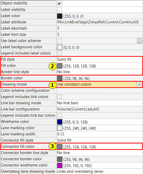 Graphic parameter에서 Drawing Mode를 Use constant colors로 변경하게 되면(아래그림 1번 참고), 아래 그림의 2번, 3번 설정창이 활성화 된다. 2번은 Link속성을 편집할 수 있고, 3번은 Connector 속성을 편집할 수 있다.