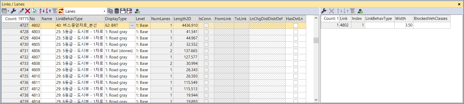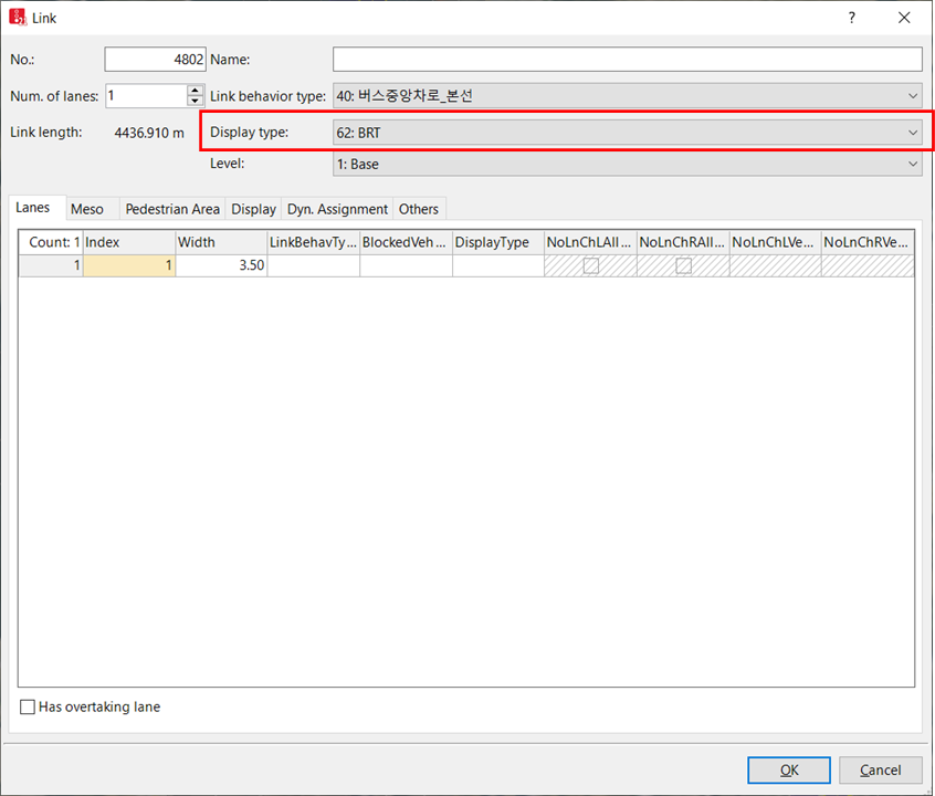 이후 새로운 display type을 vissim link에 적용을 시켜주어야 한다. 변경하고자 하는 Link를 Link List에서 DisplayType을 변경하거나, "더블클릭"을 한 뒤 열리는 Link option 창에서 Display type을 새로 만들어준 display type을 설정하면된다.