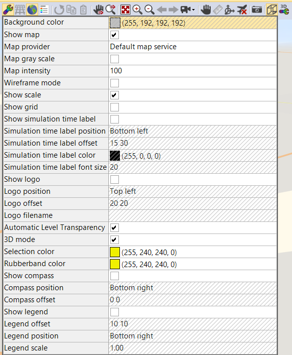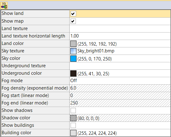 여기서는, 지도 설정, 시뮬레이션 시간, 로고 삽입등이 가능하며 3D 설정에서는 안개상황과같은 것을 표현할 수 있다.