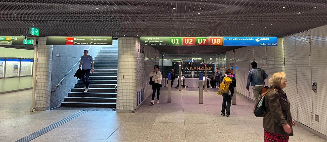 아래 사진을 기반으로 추가설명을 하면, 오른쪽으로 가면 U반을 탑승할 수 있는 플랫폼으로 갈 수 있다. 해당경로를 따라가게되면 U반의 U1, U2, U7, U8 노선의 열차를 탑승 할 수 있다. 왼쪽 계단으로 올라가면 Tram탑승 정류장에 갈 수 있으며, 해당 정류장에는 16번, 17번, 19번, 29번의 Tram을 탑승할 수 있다. 사진에 잘 안보이지만, 계단 왼쪽의 또 다른 경로로 가게되면, (현재 사진 상) U4, U5, 68번 버스를 탑승할 수 있는 곳으로 이동하는 경로라는 것을 알 수 있다.